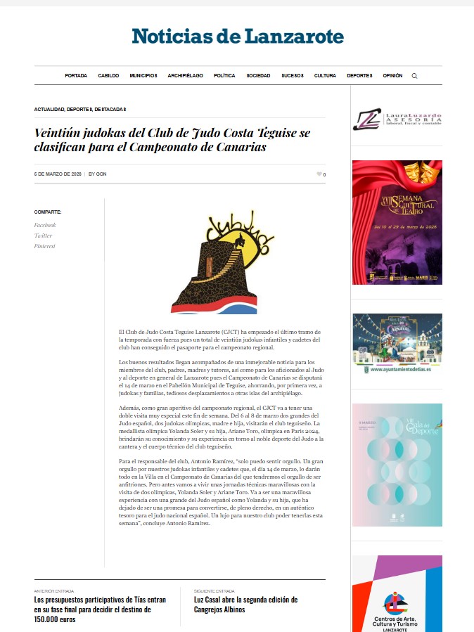Posted on 05/03/2026 por Arminda Levonkallio Collado Veintiún judokas del Club de Judo Costa Teguise se clasifican para el Campeonato de Canarias